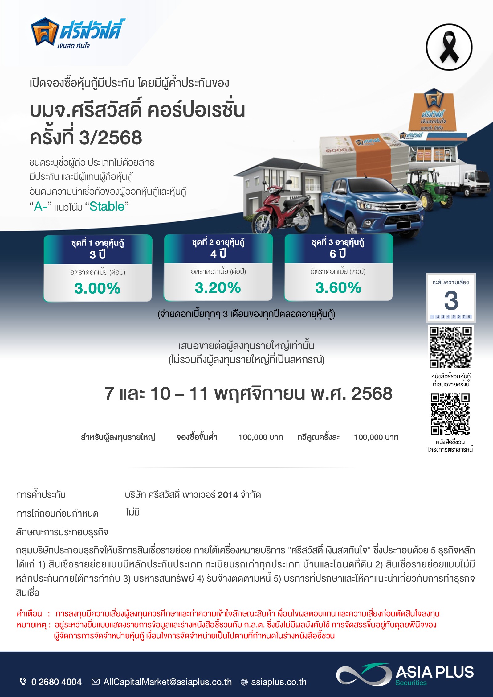 เปิดจองหุ้นกู้มีประกัน โดยมีผู้ค้ำประกันของ บริษัท ศรีสวัสดิ์ คอร์ปอเรชั่น จำกัด (มหาชน) - SAWAD